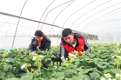 近年来,余庆县以党建为引领,大力调整产业结构,采取“支部+合作社+农户”的模式,鼓励和引导农民大力发展特色精品水果种植,促进农业增效和农民增收。图为该县白泥镇上里社区草莓迎来成熟期,党员志愿者帮助农户采摘。
