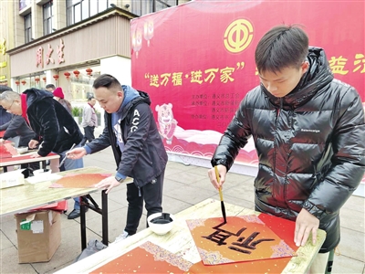 1月18日,市总工会在新蒲新区开展“送万福 进万家”活动,邀请市书法家协会部分成员现场书写春联赠送市民。图为活动现场。