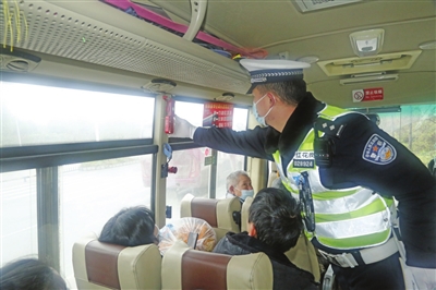为加强春运期间客运车辆交通安全管理,遵义市公安交通管理局红花岗大队加强客运车辆路检路查力度,对其安全设施配备、安全带使用、是否超员等情况进行检查。图为该大队民警检查客运车辆安全锤情况。 (记者 张婷 摄)