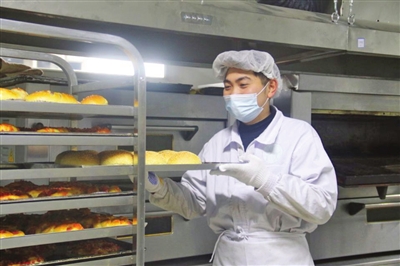 在位于仁怀市苍龙街道凤凰社区的贵州卡尔客斯食品有限公司扶贫车间里,工人们正在烘焙食品。为解决易地扶贫搬迁群众的就业问题,该社区党总支引进服装厂、蛋糕加工厂“扶贫车间”,让搬迁群众实现“挣钱顾家两不误”。图为搬迁群众张超正在烘焙面包。 (记者 一丁 摄)