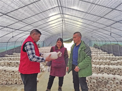 红花岗区深溪镇清江村党总支采用“公司+合作社+农户”发展方式,大力推动食用菌产业发展。目前,该村主要种植的平菇、香菇等日均产量达1000斤左右。图为清江村丰桥党支部党员袁志才(左一)为农户作技术指导。 (李孟珈 摄)