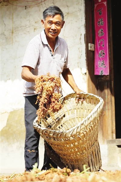 罗启勇将高粱穗从竹背篓拿出来晾晒。