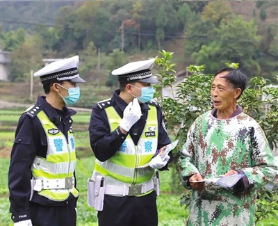 连日来,市公安交通管理局城市交警二大队以“美丽乡村行”巡回宣讲活动为载体,持续开展交通安全宣传进农村活动。图为交警在汇川区高坪街道新拱村向村民宣传交通法律法规知识。 (记者 何骥淯 摄)