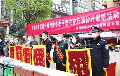12月7日,红花岗公安分局长征派出所联合红花岗区长征街道办事处举行“双提升”宣传暨冬季平安守护行动公开退赃活动,将近期侦破案件追回的赃款赃物集中退还给受害人。图为群众给民警送锦旗表示感谢。