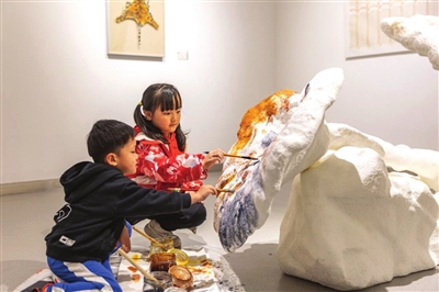 4月6日,在“百草创艺”中医药艺术作品展现场,两名小观众在互动体验区用废弃的中药材萃取的颜料绘画。