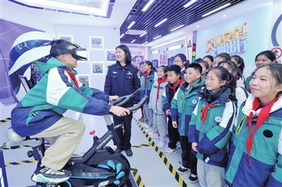 12月2日,在江苏省宿迁经济技术开发区厦门路实验学校内的“交通安全体验馆”,学生在民警指导下体验VR骑行。