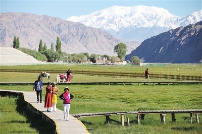 7月9日,游客在新疆塔什库尔干塔吉克自治县帕米尔高原阿拉尔国家湿地公园游玩。 盛夏时节,地处中国西陲的帕米尔高原绿草茵茵、雪山连绵,以最美的身姿迎接旅游旺季。各地游客前来新疆塔什库尔干塔吉克自治县,领略壮美的自然风光,感受浓郁的人文风情。据塔县旅游部门统计,2019年上半年,全县累计接待游客55.41万人次,同比增长43.26%。 (新华社)