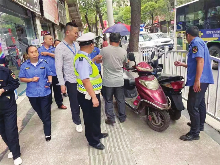 连日来,红花岗区综合行政执法局深入开展市容环境整治,对步行街、中华路、中山路等重点路段开展以乱停乱放、占道经营、噪音扰民为重点的市容秩序集中整治行动,确保城市环境干净整洁有序。 (记者 王秦龙 摄)