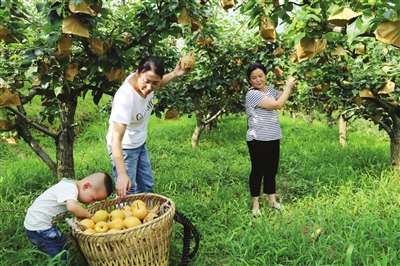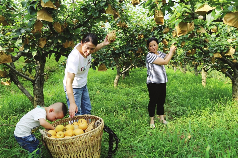 眼下,凤冈县蜂岩镇一品泉社区的金秋梨进入成熟采摘期,呈现一派丰收景象。近年来,该社区以党建为引领,依托当地自然资源条件,以“支部+合作社+大户”模式发展金秋梨1500余亩,带动当地600余名村民增收。图为游客在十二湾金秋梨基地采摘。