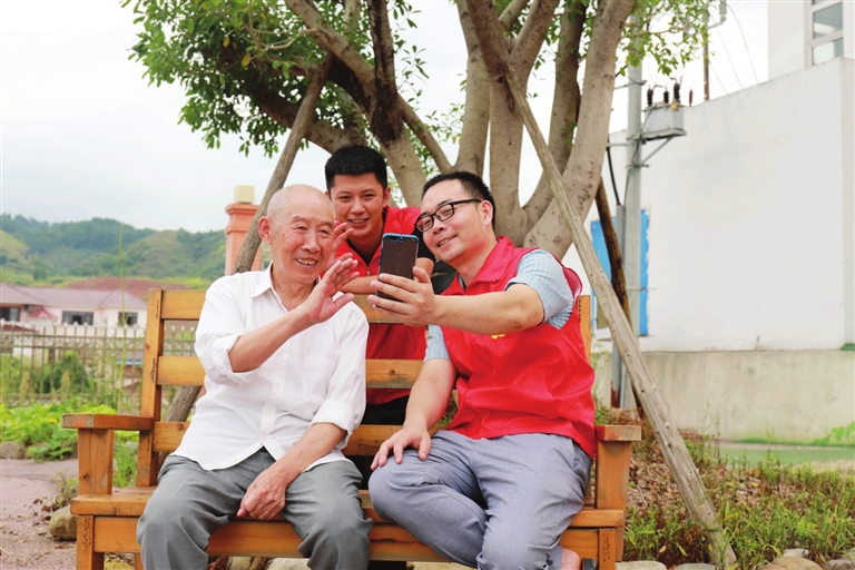 近日,余庆县开展“情系老人·秋送温暖”志愿服务活动,组织党员干部走进“春风小院”,与老人唠家常,倾听他们的心事。图为党员干部利用智能手机帮助老人与远方的家人在线聊天。 (记者 一丁 摄)