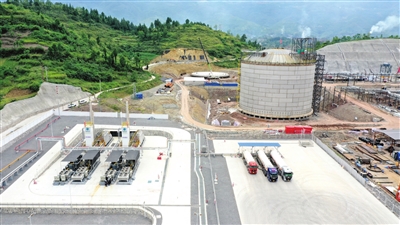 与此同时,为了回收利用页岩气,在正安县安场镇官井村,一个LNG储配库项目正在全力实施,该储配库相当于一个框架式结构的加液站,具有工艺流程简单、便于运输等特点。目前储配库项目的一期工程预计2021年10月底建成,届时将形成2800万立方米的储气能力。图为正在建设中的LNG储配库。