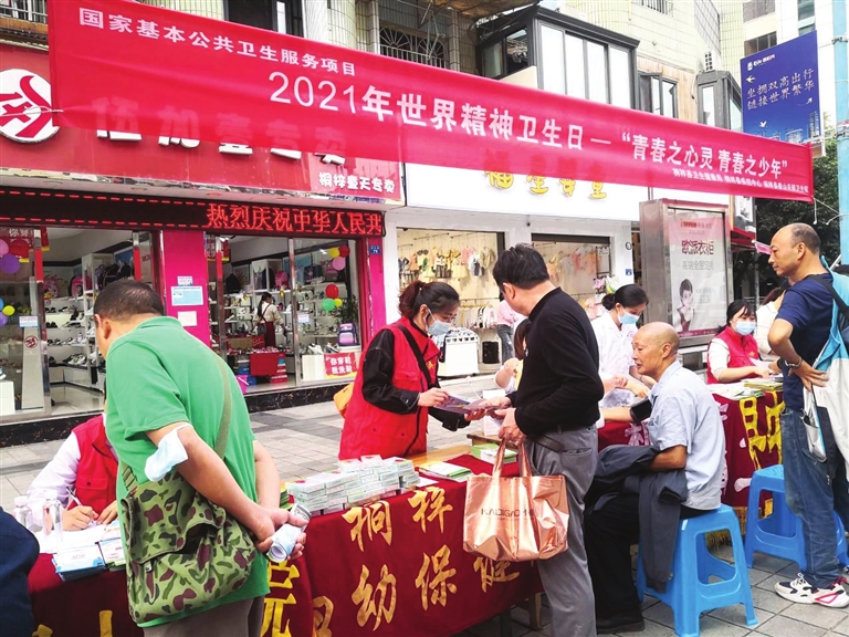 近日,桐梓县妇幼保健院开展世界精神卫生日——“青春之心灵 青春之少年”宣传活动,通过现场义诊和发放宣传册等方式,进行精神卫生、心理健康知识宣传。图为桐梓县妇幼保健院党员干部向行人发放宣传资料。