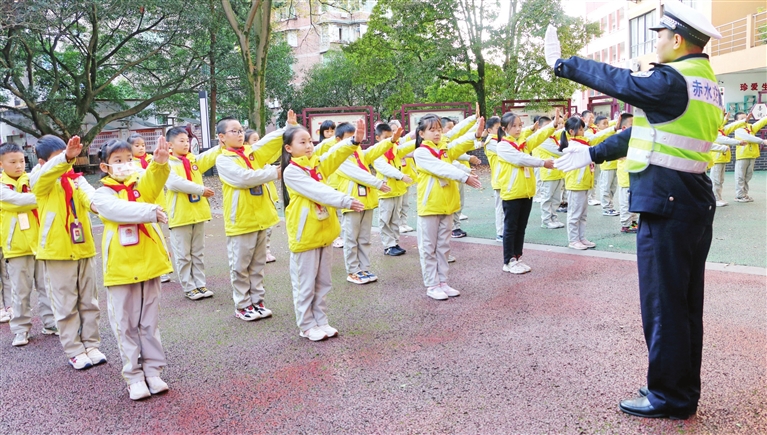 在“全国交通安全日”到来之际,赤水市市中街道滨江社区党员志愿者联合交警走进学校,开展交通安全宣传教育活动。图为交警教学生打交通手势学交通规则。