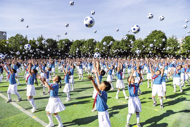 12月1日,南宁市滨湖路小学学生在表演足球操。