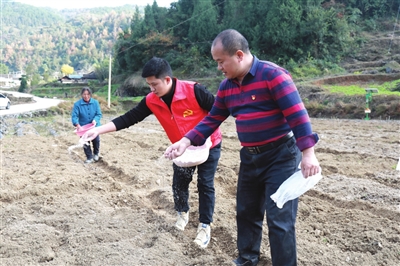 冬种时节,余庆县深入开展“我为群众办实事”实践活动,选派百名农技人才下基层,帮助解决农业小微企业、产业大户和群众在农业产业发展中的技术难题。 图为农技专家在余庆县白泥镇大龙村蔬菜基地指导农户科学播撒有机肥。 (记者 杨刚 摄)