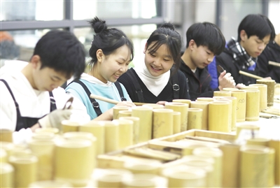 12月19日,在赤水市中等职业技术学校,学员在进行竹雕创作。