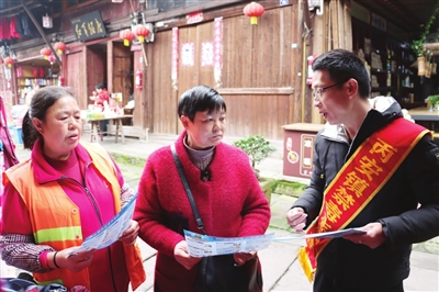 为筑牢禁毒防线,赤水市丙安镇利用赶集日组织党员志愿者深入古镇街道,向群众宣传禁毒知识。 图为12月16日,该镇党员志愿者向群众发放宣传单并讲解毒品危害。 (记者 陆邱珊 摄)