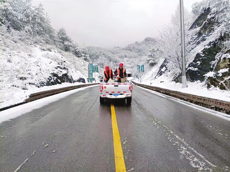 截至12月26日12时许,该局启用破冰除雪排水设备3台、应急通信设备16台,出动应急抢通车辆25辆。图为桐梓公路管理段工作人员在G352线马鬃路段撒融雪剂。