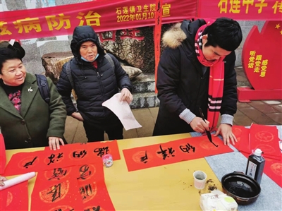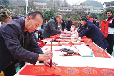 近日,湄潭县石莲中学组织开展送春联、迎新春活动,该校老师为群众书写春联450多幅。图为活动现场。 (记者 肖时雨 摄)