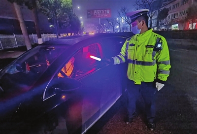 连日来,遵义市公安交通管理局针对酒驾等交通违法行为开展整治行动,进一步强化广大驾驶员的安全意识。图为1月15日晚,交警在播州区开展夜查工作,查获酒驾8起。 (记者 王秦龙 摄)