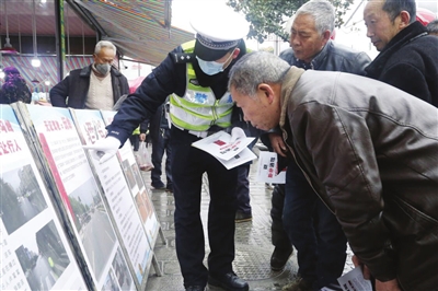 近日,遵义市公安交通管理局红花岗大队组织民警深入辖区农村地区,加强对群众春节期间出行交通安全的宣传教育,提升群众交通安全意识。图为民警向群众讲解无证驾驶、酒驾醉驾的危害。 (记者 张婷 摄)