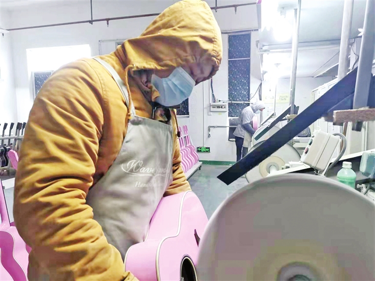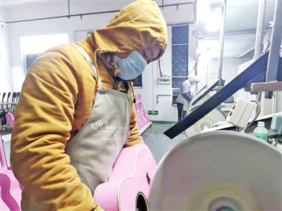 而在正安·国际吉他园内,马氏吉他公司2月7日复工。走进生产车间,机械臂抓住流水线上的吉他进行打磨处理,工人们在各自的岗位上忙碌着。