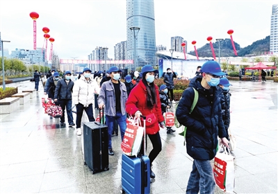 2月8日12时,由遵义市人力资源和社会保障局、珠海市人力资源和社会保障局、广东省粤黔协作工作队遵义工作组以及成都铁路局遵义车务段共同开行的“珠遵劳务直通车”返岗专列D1869次列车从遵义站出发,600多名遵义籍返岗务工人员免费搭乘该专列前往广东省珠海市复工。据悉,这是贵州省今年开行的首趟返岗务工动车专列。 (记者 徐飞 张婷 摄影报道)