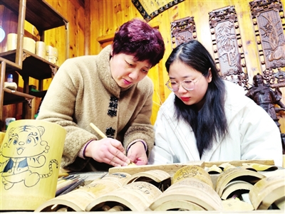 2月8日,在赤水非遗馆,省级非遗赤水竹雕技艺传承人卢华英和女儿田雅嘉一起钻研竹雕工艺,创作出一个个惟妙惟肖的“虎”图竹雕作品。 (张浪 摄)