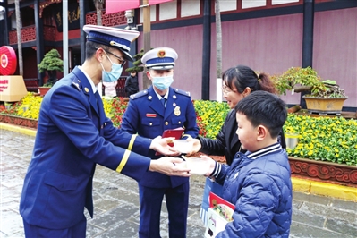 近日,遵义市红花岗区会址消防救援站在红花岗区老城纪念广场开展了“新年祝福送万家”活动,为社区居民、游客、环卫工人、执勤交警等送上新春祝福。 (记者 肖时雨 摄)
