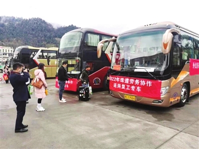 2月7日,务川自治县举行2022年珠遵劳务协作“返岗复工”集中输出仪式,首批34名农民工乘坐劳务专车赴珠海务工。 (牟珍超 摄)