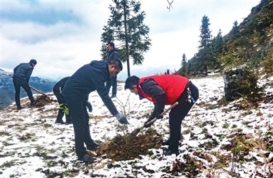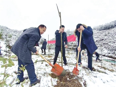 2月8日,余庆县花山苗族乡组织党员干部开展植树活动,为家乡增绿添彩。图为植树现场。 (记者 一丁 摄)