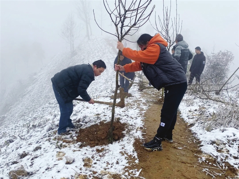 2月7日,务川自治县红丝乡机关党支部组织党员干部开展植树活动。当天,党员干部们在该乡上坝村野猫水种下15亩柚子树苗木。 (邹狄锯 摄)