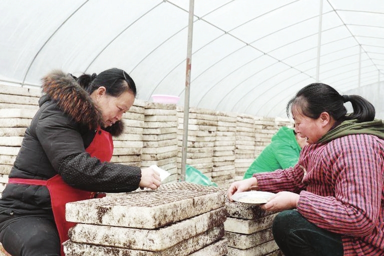 今年,余庆县白泥镇春景村采取“集体经济+农户入股”模式,发展辣椒种植700余亩,积极为村民增产增收提供保障。图为村民正在大棚里培育辣椒苗。 (记者 一丁 摄)