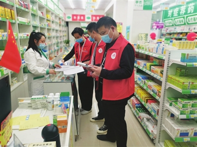 连日来,红花岗区长征街道党工委以“街道、村(社区)、组(小区)”三级网格联动模式,组织党员干部深入包保网格开展疫情防控宣传。图为党员干部在辖区一药房了解相关情况。 (王莹莉 摄)