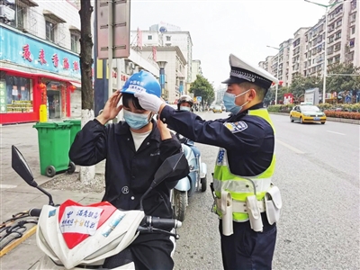 连日来,遵义市公安交通管理局组织民警在全市范围内开展摩托车、电动自行车专项整治行动,严查摩托车、电动自行车驾乘人员不按规定佩戴安全头盔、酒驾醉驾、超员、疲劳驾驶等违法行为。 (记者 王秦龙 摄)