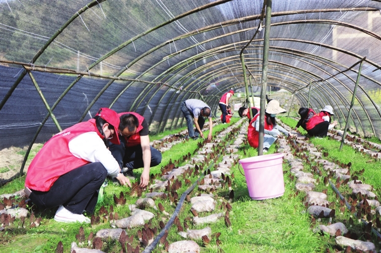 播州区洪关苗族乡小坝场村羊肚菌种植基地内的羊肚菌陆续成熟。近日,该乡相关部门组织部分党员志愿者来到基地内,帮助种植户采摘羊肚菌。 (赵双庆 摄)