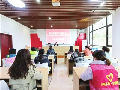 近日,新蒲新区新中街道文化社区组织社区普法志愿者,向辖区妇女、儿童等开展《法律援助法》主题宣讲活动,加大法律援助宣教力度。 (记者 张婷 摄)