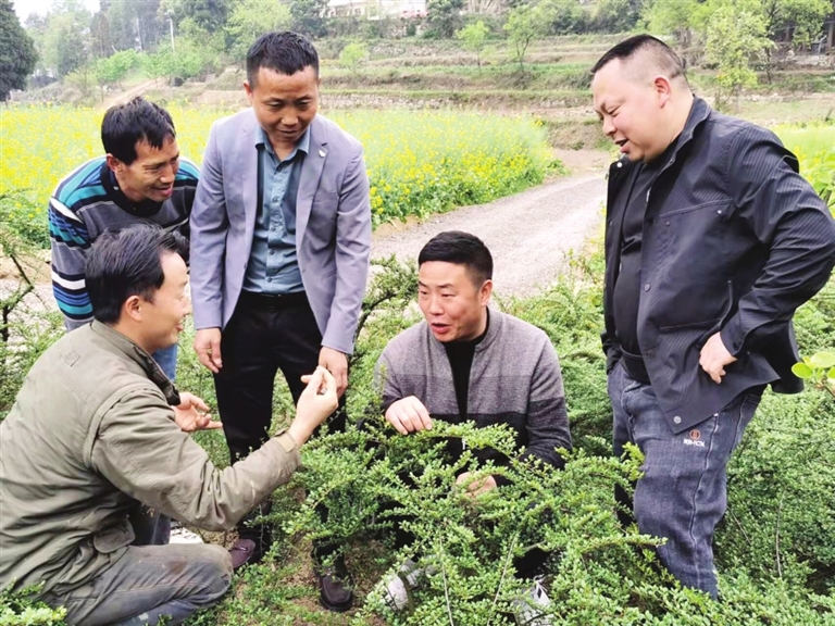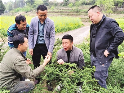 家住习水县回龙镇洞湾村的罗浩,自2008年返乡后,从事盆栽植物种植。目前,已种植火棘9000多株、荀子30万株,还种有金弹子、小叶红杜鹃等多种盆栽植物,同时带动当地10余户村民发展盆栽产业。图为罗浩(左一)向前来参观的游客介绍荀子修剪整形技术。 (记者 樊明富 摄)
