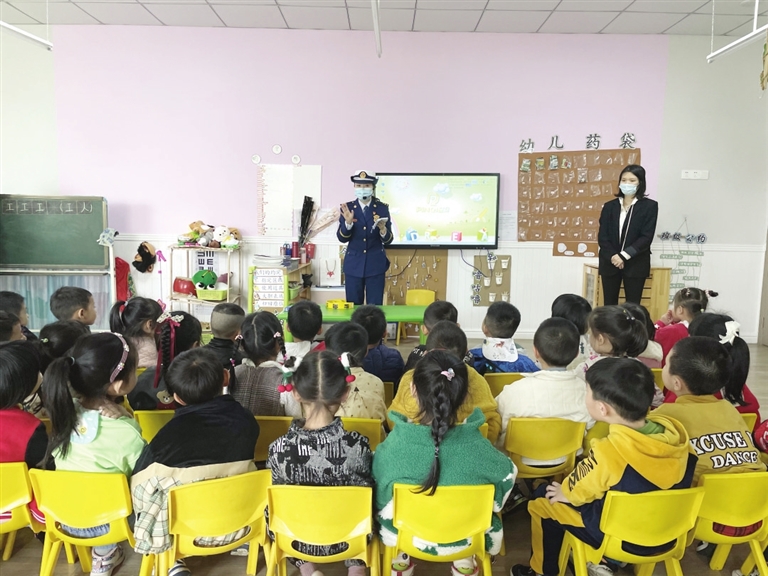 为加强人员密集场所消防安全管理,近日,遵义市消防救援支队红花岗大队对辖区部分幼儿园开展消防安全专项检查。图为该大队防火监督员为幼儿园小朋友讲解消防安全知识。 (王锡红杨 摄)