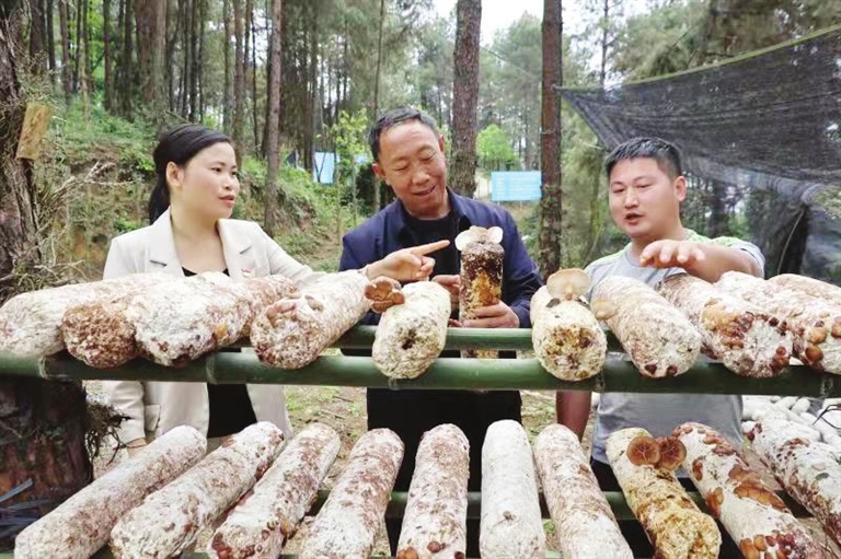 近年来,仁怀苍龙街道下坝村采取“铁皮石斛+林下种菌”长短结合的方式,利益联结当地群众,助农增收。今年,该村在1500亩的铁皮石斛基地里套种马桑菌60000棒。 图为种植基地里的群众在检查菌棒。 (梁云叶 摄)