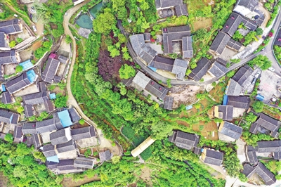 图为4月16日拍摄的余庆县白泥镇哨溪村河滨民宿一角(无人机照片)。