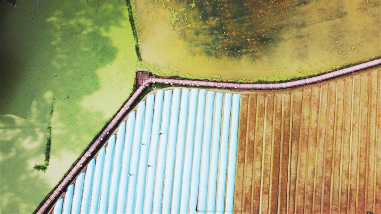 4月26日,村民在贵州省黔东南苗族侗族自治州台江县台盘乡阳芳村水稻育秧基地管护水稻秧苗(无人机照片)。