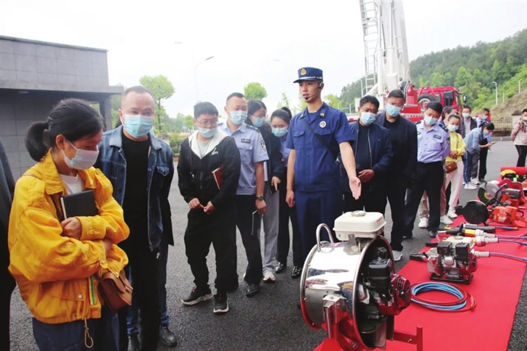 5月12日,新蒲新区虾子镇组织开展防灾减灾消防安全培训活动,该镇各部门、各村(社区)负责人及相关领域从业人员等参加培训。培训中,消防救援人员展示了应急救援装备,并现场讲解其用途和使用方法。 (记者 张婷 摄)