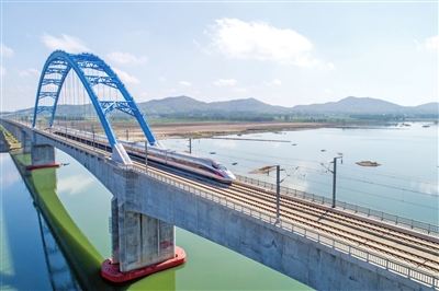 6月20日,一辆郑渝高铁列车在汉江上驶过(无人机照片)。