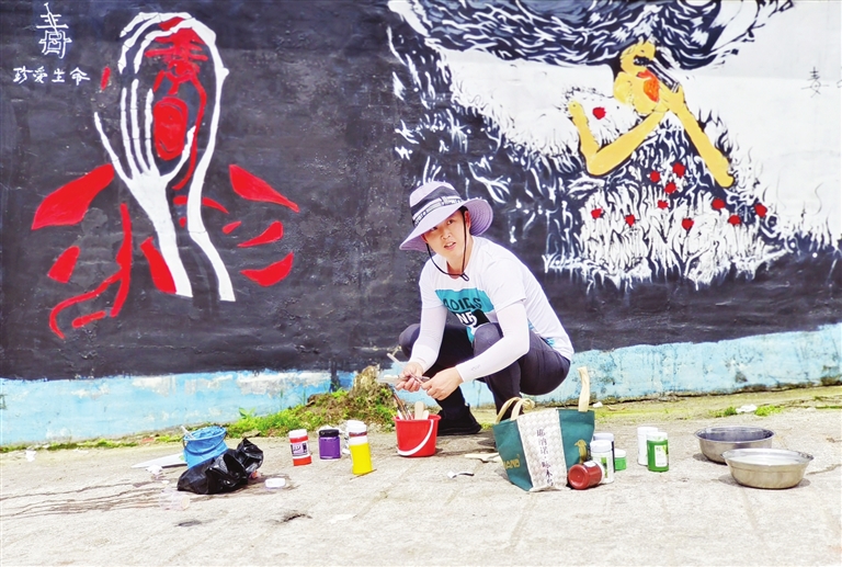 6月中旬以来,习水县三岔河镇进一步加大禁毒宣传教育力度,开展以“珍爱生命,远离毒品”为主题的禁毒墙画绘制工作,组织志愿者在该镇临街临巷的墙体处绘制禁毒知识漫画,以增强广大群众识毒、防毒、拒毒的意识。图为志愿者在绘制禁毒墙画。 (记者 徐飞 刘晓松 摄影报道)
