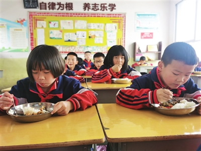 “学校午餐每天都有肉,还有各种蔬菜,每餐还发一盒牛奶或水果,我们比在家里还要吃得多一些。”该校六年级(1)班的陈馨同学说。
