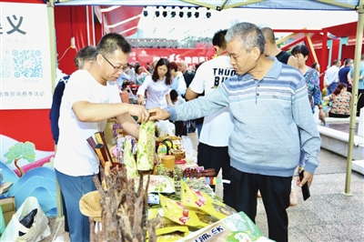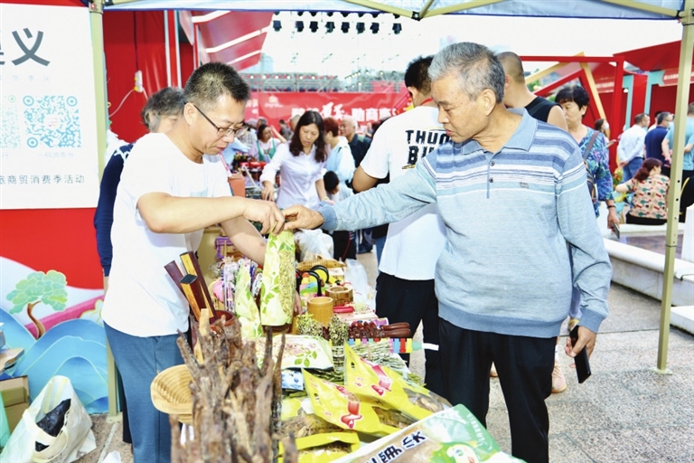 活动期间,老城纪念广场热闹非凡,丰富多彩的文艺演出,为市民朋友呈现出一场场视听盛宴。舞台边的展销摊位上,张氏空心面、石佛洞牛肉干、油纸伞、赤水竹工艺品、湄潭干豆豉、苕丝糖、农家腊制品等产品激发了市民的购买热情,这里俨然成了一个热闹的集市。