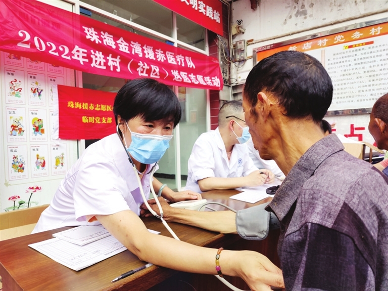 6月21日,赤水市天台卫生院党支部联合珠海援赤志愿医疗队临时党支部,派出医护人员来到天台镇新店村,开展免费送医送药送健康活动,让村民在家门口享受专家服务。 (张浪 摄)