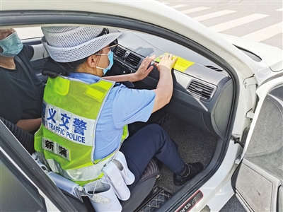 为全面推进夏季治安打击整治“百日行动”,提升网约车驾驶人、乘客的道路安全意识,连日来,遵义市公安交通管理局所属各交警大队组织民警通过在网约车内张贴网约车经营安全服务提示卡的方式,提醒网约车驾驶人安全驾驶、乘客选择正规网约车乘坐。图为新蒲交警大队民警在网约车内张贴安全服务提示卡。