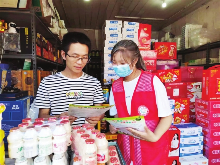 新蒲新区永乐镇扎实抓好深化全国文明城市建设宣传志愿服务活动,不断推动文明和谐村(社区)建设。图为志愿者向商户宣传相关知识。